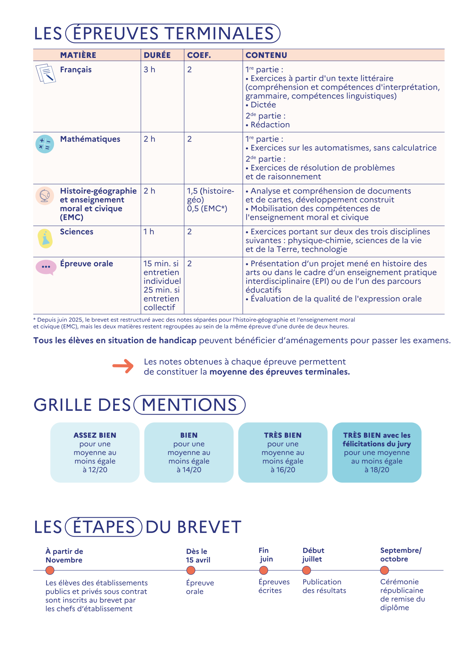 Depuis juin 2025, le diplôme national du brevet est restructuré avec des notes séparées pour l’histoire-géographie et l’enseignement moral et civique (EMC), et introduit la mention « Très bien avec félicitations du jury ».