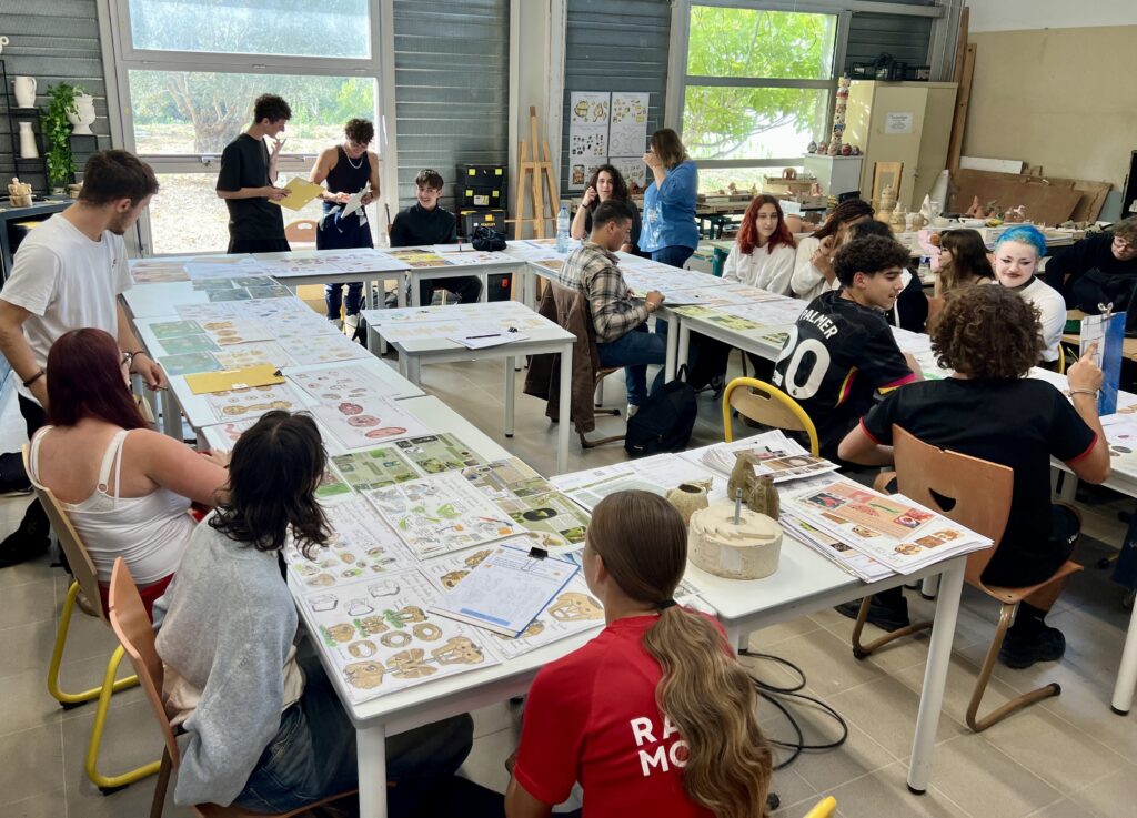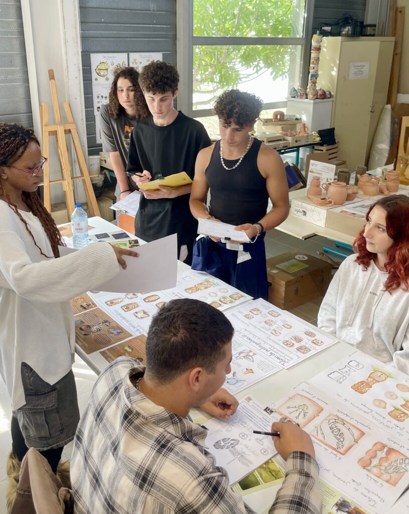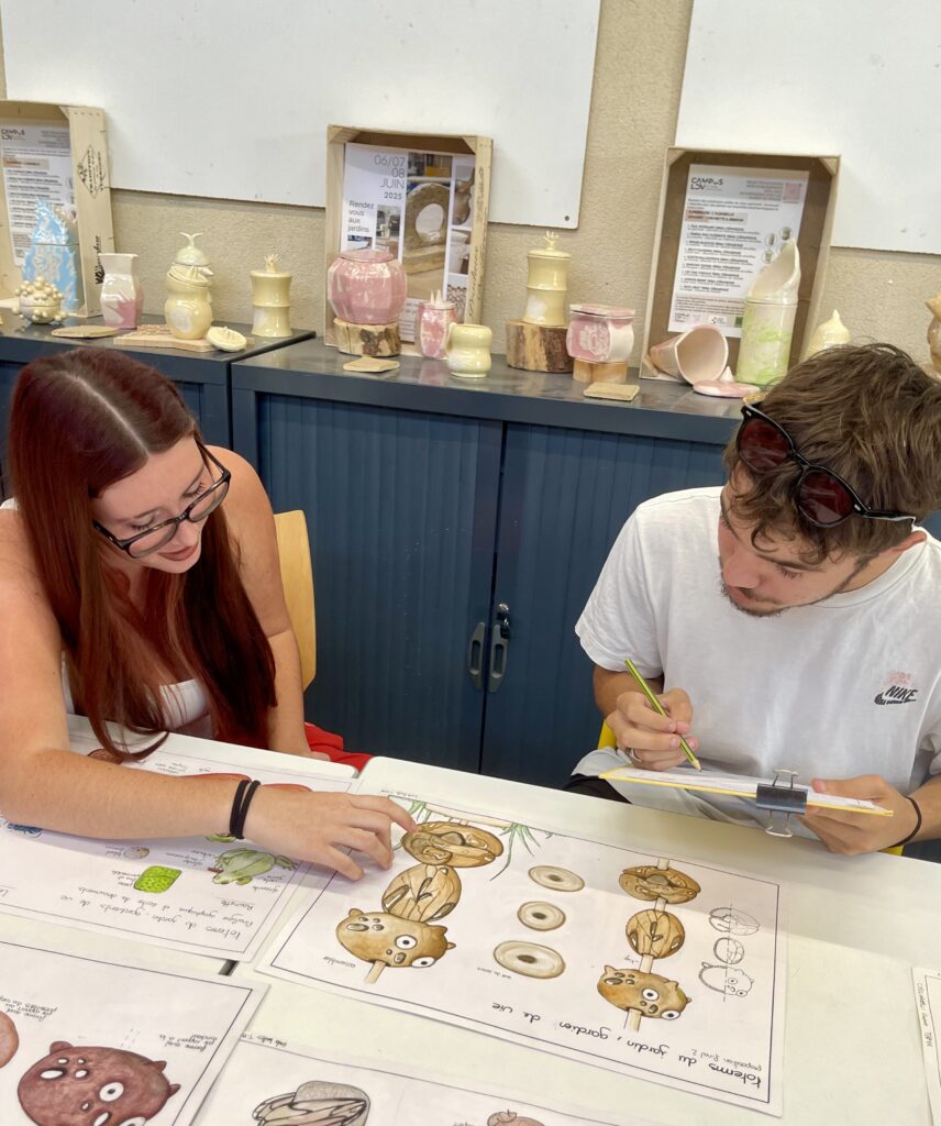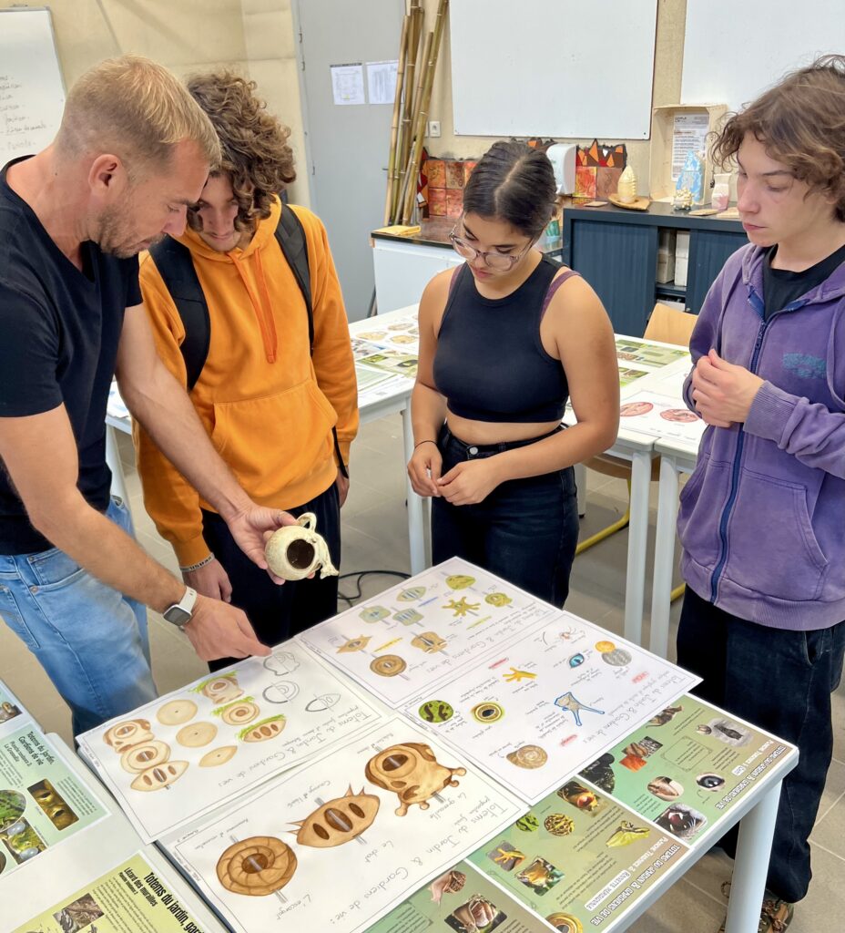 Deuxième temps fort : le 10 octobre, ils se sont rendus au lycée Léonard de Vinci pour rencontrer les élèves de Terminale BMA (Brevet des Métiers d’Art). Ensemble, ils ont lancé la création d’un totem collectif, associant pièces en métal et en céramique, inspirées de la faune et de la flore du MAHP et des jardins du MIP.